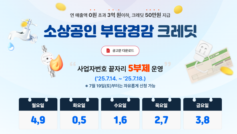 접수 초기 혼잡을 피하기 위해 신청 첫 주는, 2025년 7월 14일 부터 사업자등록번호 끝자리에 따라 5부제를 운영합니다.
